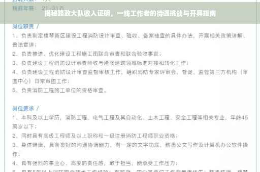 摘要:本文将揭示路政大队的收入证明真相,深入了解一线工作者的真实待遇和日常所面临的挑战。文章将介绍如何获取路政大队的收入证明,包括一线工作者的薪资水平、福利待遇等细节。也将探讨他们日常工作中所面临的工作压力、安全挑战等实际问题。通过本文,读者可以更全面地了解路政大队的工作状况和待遇情况。