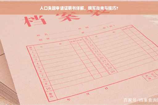 摘要:本文将详细介绍人口失踪申请证明书的撰写过程。文章将包括如何准备相关材料、证明书的格式要求、填写关键信息的注意事项等内容。通过阅读本文,您将了解到如何正确书写人口失踪申请证明书,以便在需要时提供准确、全面的信息。