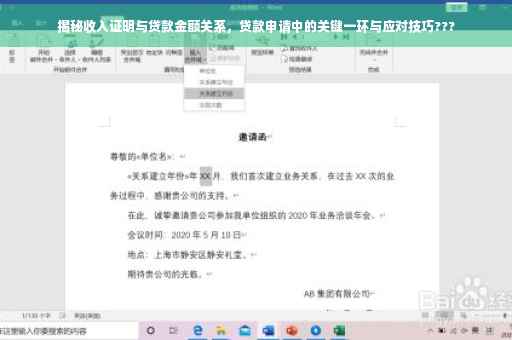 在现代社会,随着经济的发展和金融市场的繁荣,越来越多的人开始接触和使用贷款产品,而在申请贷款的过程中,收入证明成为了至关重要的环节,收入证明与贷款金额之间究竟存在怎样的关系?如何巧妙应对这一环节,提高贷款申请的成功率?本文将为您揭示其中的真相。