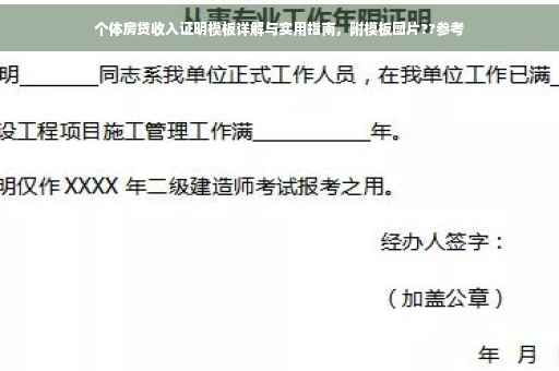 摘要:本文将详细介绍个体房贷收入证明模板,包括其格式、内容和填写要点。提供实用的指南和模板图片,帮助申请者顺利准备和完成房贷收入证明,以顺利申请个体房贷。本文旨在帮助读者了解整个流程,确保顺利获得银行批准。