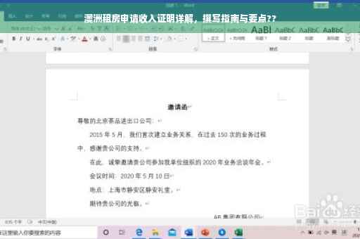 摘要:本文介绍了澳洲租房申请中收入证明的重要性和撰写方法。在申请租房时,提供详细的收入证明是获得批准的必备条件之一。本文详细解释了如何撰写收入证明,包括应包含的关键信息和注意事项,以帮助申请者顺利获得澳洲租房申请批准。