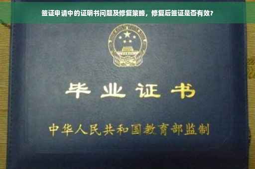 摘要:本文探讨了签证申请中证明书问题及其修复策略。针对修了证明书后签证是否有效的问题,指出申请者需确保证明书真实有效并与签证申请要求相符。提供了解决证明书问题的策略,包括及时更正错误、提供补充材料等。申请者在面对签证中的证明书问题时,应及早处理以确保申请顺利进行。