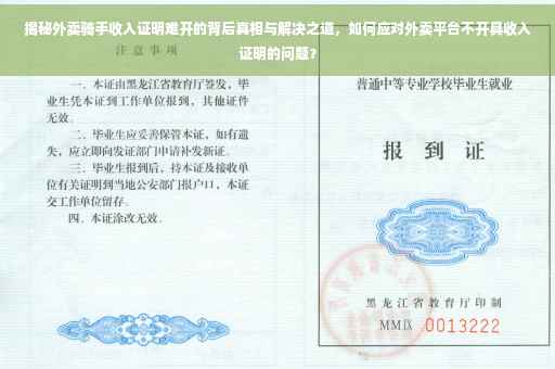 摘要:外卖骑手收入证明难以开具的问题背后涉及多种因素,包括平台政策、公司规定等。面对这一问题,骑手们感到困惑和无助。本文将探讨这一现象背后的真相,并寻求解决之道。针对外卖平台不开具收入证明的情况,本文提出一些建议,以帮助骑手们找到合理的解决方案。