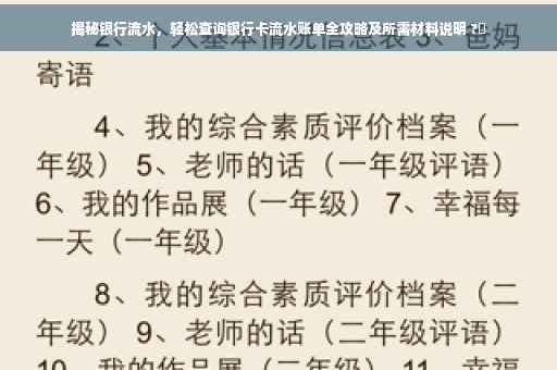 摘要:,,本文将揭秘如何轻松查询银行流水账单,包括所需材料和步骤。只需携带个人身份证和银行卡,前往银行柜台或使用自助查询机即可查询。还提供网上银行的查询方法。了解银行流水账单的重要性,有助于个人财务管理和信用评估。本文旨在帮助读者快速掌握查询技巧,轻松管理个人财务。