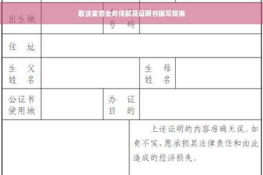 在取消宽带业务时,务必了解相关政策、规定及流程,确保顺利办理,在撰写取消宽带业务证明书时,应准确描述当事人的信息、取消原因、办理流程等,确保证明书的真实性和有效性,本文提供的撰写要点和实例展示可作为参考,以便您在撰写证明书时更加便捷,希望本文能对您在取消宽带业务过程中提供实质性的帮助,如有更多疑问,建议咨询相关专业人士或宽带服务提供商。