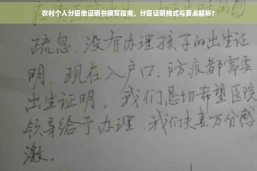 摘要:,,本文将介绍如何撰写农村个人分田地的证明书。内容包括证书的基本格式、必要信息和要点,如证书编号、分田人的姓名、身份证号码、田地位置、面积、四至界限等。强调证明书的真实性和法律效力,要求书写清晰、准确,并加盖公章。本文旨在为农民朋友提供撰写分田证明的指导,以便更好地维护自己的合法权益。