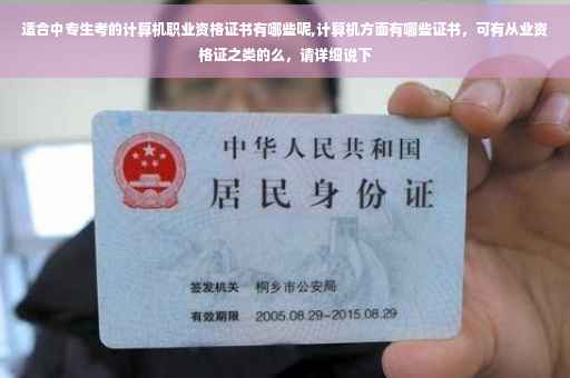 计算机在中国目前有三种从业资格证书,一类是操作证书,由劳动部门颁发,可通过各种社会培训机构参训后报名参加考试,如一级、二级和普通操作证书;二类是专业技术证书,由工信部组织考试,各省颁发证书,直接网上报名参加考试,分初级、中级、高级,如程序员、系统分析师、信息系统项目管理师、构架师等证书;三类是由专业信息公司组织专门的实用技术考试,颁发专业从业资格证书,如西门子交换机维护工程师、ORACLE数据库维护工程师、华为路由器售后服务工程师等证书。