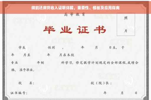 摘要:,,本文将探讨提前还房贷收入证明的重要性,并详细解读其内容和要求。收入证明在提前还房贷过程中具有关键作用,因为它能证明个人的还款能力和信用状况。本文将提供一份提前还房贷收入证明模板,并指导如何正确填写,以确保顺利办理提前还款手续。通过本文,读者将了解如何有效利用收入证明来加快房贷还款进程,并避免不必要的麻烦。