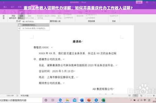 摘要:本文将详细介绍重庆地区如何代办工作收入证明。首先介绍收入证明的重要性,接着阐述代办收入证明的流程和注意事项,包括准备相关证件、填写申请表格、提交审核等步骤。最后强调在代办过程中需要注意的问题,如确保信息真实准确、遵守相关规定等。让读者了解如何顺利在重庆地区办理工作收入证明。