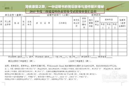 摘要:本篇内容主要讲述肾病患者的康复之路,背后隐藏着一份感人至深的证明书故事。通过展示肾病证明书原件图片,旨在分享患者战胜疾病的勇气和毅力。在康复过程中,患者需经历漫长而艰辛的治疗,最终获得康复,这是一段充满挑战与希望的旅程。