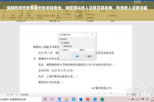在购房过程中,收入证明是贷款申请中不可或缺的一环,作为申请人,您需要提供充分的收入证明以证明您具备偿还贷款的能力,而在这个过程中,总经理的角色与收入证明的重要性不言而喻,本文将详细介绍购房收入证明总经理的角色与职责,帮助您更好地了解这一环节。