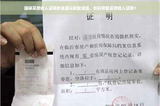 摘要:买房收入证明是购房过程中重要的财务证明文件,其来源和获取途径至关重要。购房者可以通过多种途径获取收入证明,如由雇主开具工资证明、提供银行流水账单、个人所得税纳税证明等。在获取收入证明时,购房者应注意选择正规、合法的途径,以确保证明的真实性和有效性。正确获取买房收入证明对于顺利购房至关重要。