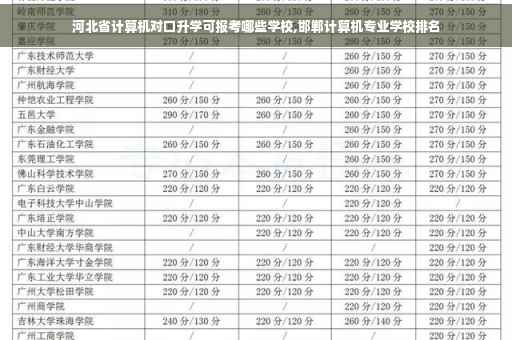 河北对口高考计算机类主要院校名单如下所示,河北大学,河北软件学院,河北师范,河北科技,石家庄铁道学院,秦皇岛东北大学秦皇岛分校,燕山大学,河北建筑学院,河北工程学院。