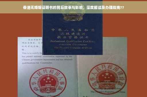 摘要:香港无婚姻证明书是一个重要文件,对于个人婚姻状况的证明具有关键作用。本文将深度解读无婚姻证明书背后的故事,包括其历史背景、现实影响以及办理流程。文章指出,无婚姻证明书可能涉及多种原因,对个人生活产生深远影响。本文将简要介绍如何办理无婚姻证明书,帮助读者了解相关流程。