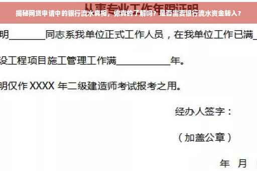 摘要:本文将揭示网贷申请中银行流水的真相,探讨申请者是否需要提供银行流水资金转入信息。通过了解银行流水的作用和重要性,读者可以更好地理解网贷申请过程中的资金流转情况,避免陷入不必要的风险。本文将简要介绍银行流水在网贷申请中的意义,并提醒申请者注意相关风险。