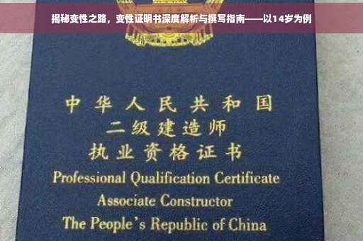 摘要:本文将深度解析变性之路的相关内容,重点探讨变性证明书的重要性和制作过程。特别是针对14岁少年的变性证明书写作方法,本文将提供指导,帮助读者了解如何准备相关文件,以便顺利进行变性手术。文章旨在提供准确、全面的信息,帮助那些在这条路上迷茫的人找到方向。