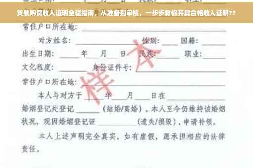 摘要:本文将详细介绍贷款购房的收入证明准备到审核的全过程。需要明确收入证明的内容和要求,包括公司名称、部门、职位和收入等基本信息。指导如何准备相关证明材料,如工资流水、税单等。强调在提交收入证明后,还需耐心等待审核结果。本文旨在帮助购房者顺利开具收入证明,顺利购房。
