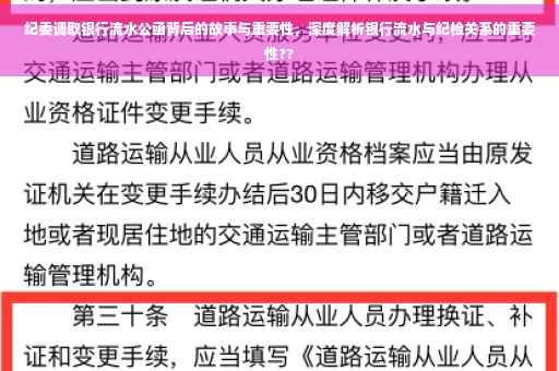 在当今社会,随着反腐败斗争的深入进行,纪委在维护党的纪律和形象方面发挥着举足轻重的作用,调取银行流水公函是纪委在履行职责过程中常用的一种手段,本文将详细介绍纪委调取银行流水公函的重要性,并探讨其背后的故事。